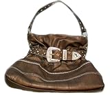 - Faux soft Brown leather Handbag accented by Silvertone Buckle and hardware studs and rivets. Rhinestones add a little Sparkle.
